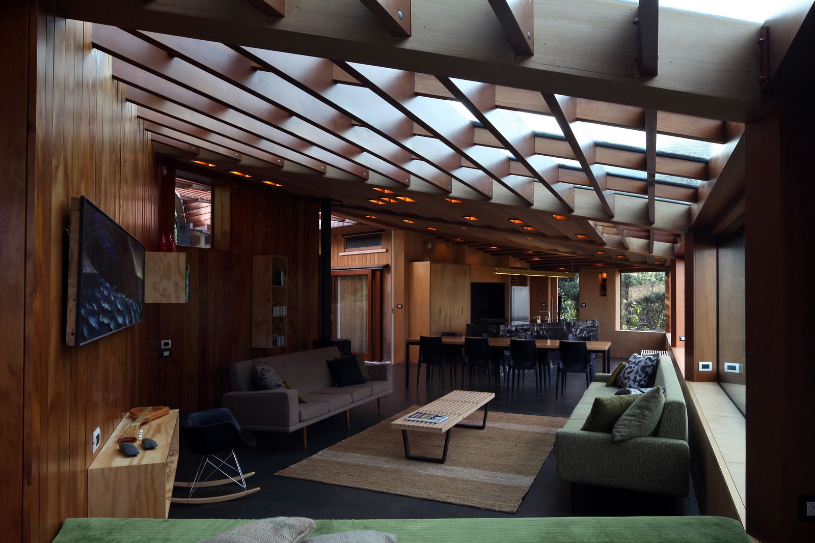 The ceiling tilts towards a band of windows that frame the view towards the beach into a horiztonal slot. Holes for lightbulb recesses are punched into the ceiling.